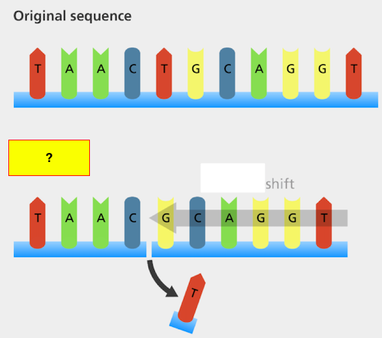 The type of mutation seen below is a _________________. The reason why is because a DNA base was ____________ from the DNA sequence. The DNA then shifts in the frame.