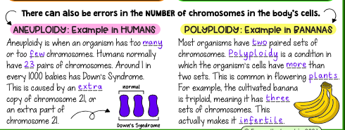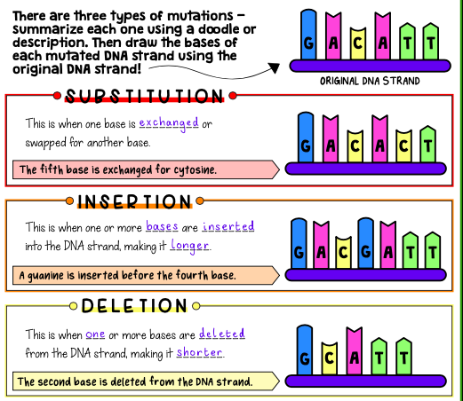 During mitosis and meiosis, DNA is replicated and then divided into daughter cells. Errors during these processes can result in chromosomal mutations. For example, deletion is when part of a chromosome is removed. This and other examples are shown below.