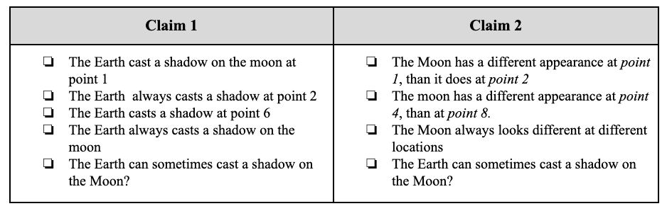 - Claim 1: The Moon’s appearance changes because Earth casts a shadow on the Moon.