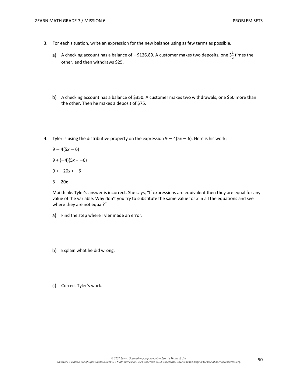 3. For each situation, write an expression for the new balance using as few terms as possible.