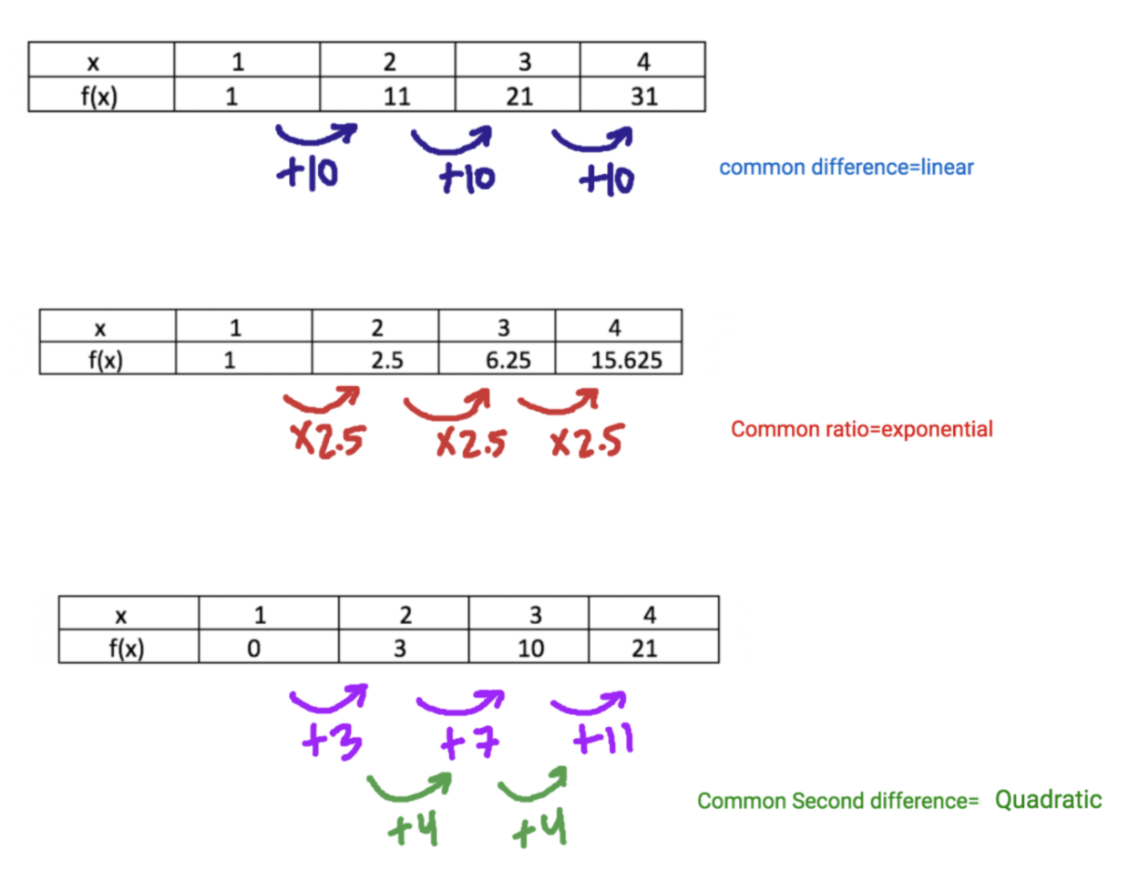 Quadratic- will not have a comon difference or ratio. But you want to check the difference between the differences (referred to as the second difference). If this is the same, it will be quadratic.