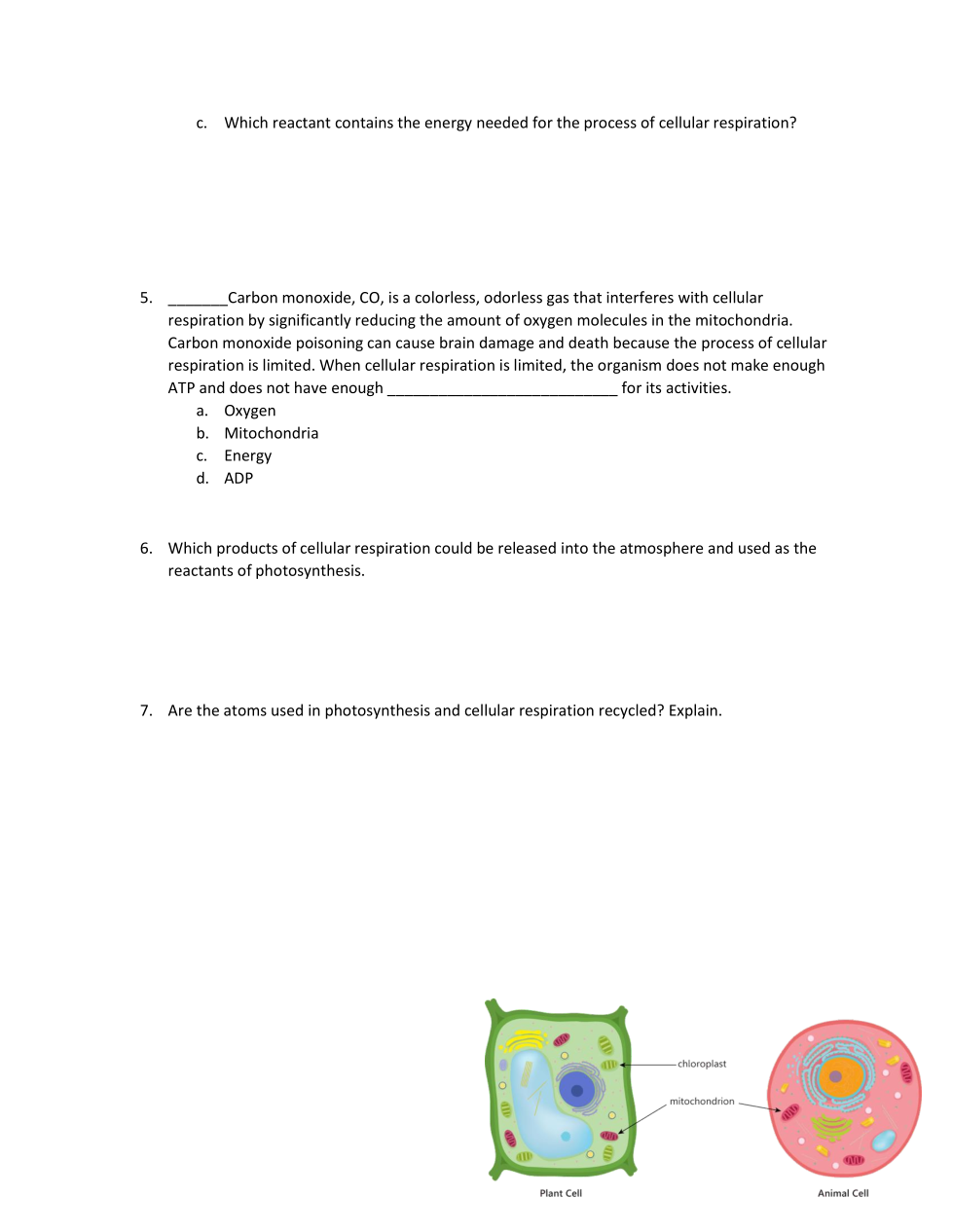 Carbon monoxide, CO, a colorless odorless gas that interferes with cellular respiration by significantly reducing the amount of oxygen molecules in the mitochondria. Carbon monoxide poisoning can cause brain damage and death because the process of cellular respiration is limited. When cellular respiration is limited, the organism does not make enough ATP and does not have enough __________ for its activites
