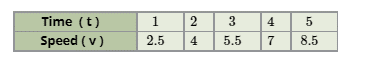 The table below shows the speed v (in km/s) of a plane at time t seconds.