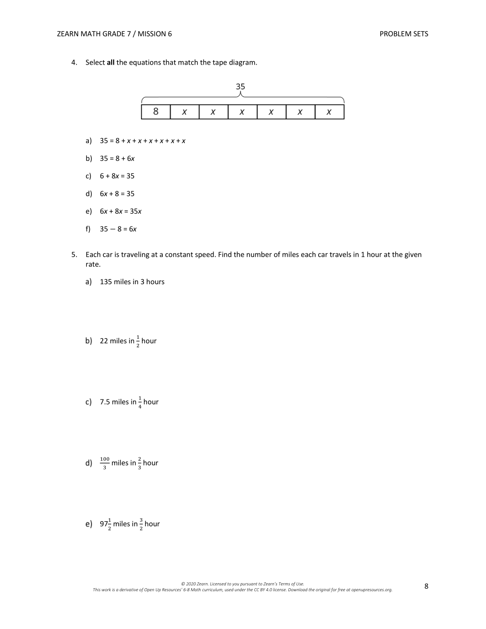 5. Each car is traveling at a constant speed. Find the number of miles each car travels in 1 hour at the given rate. d) 100/3 miles in 2/3 hour