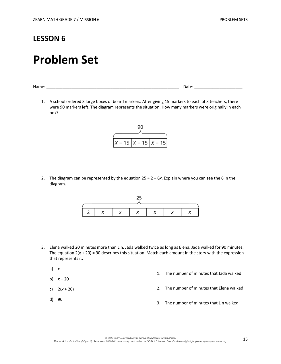 Write an equation for each story. Then, find the number of problems originally assigned by each teacher.