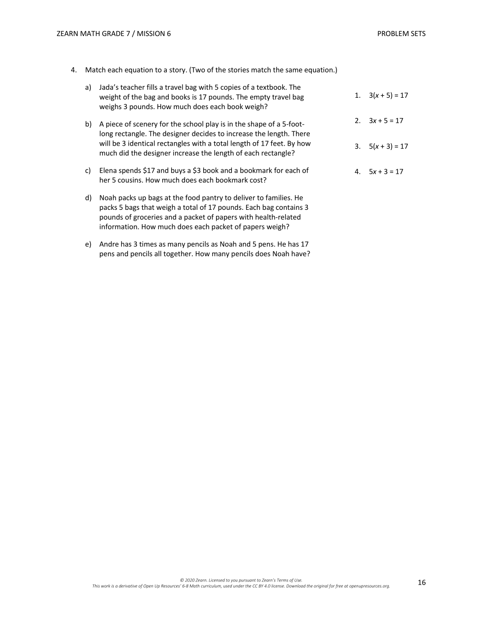 4. Match each equation to a story. (Two of the stories match the same equation.)