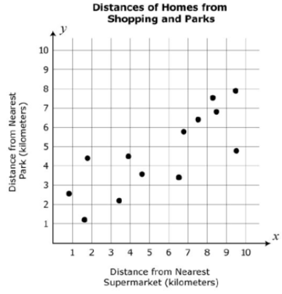 The scatterplot represents data on the distances of several homes from shopping and parks.