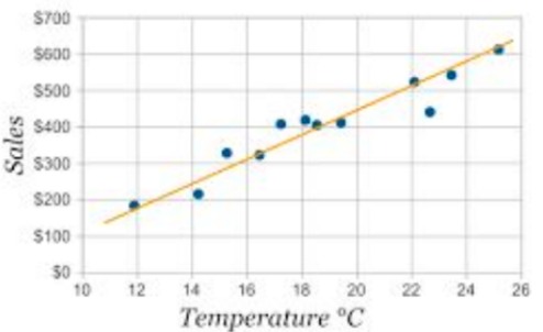 Based on the line of best fit for the scatterplot, what are the predicted sales when the temperature is 20 degrees Celsius?