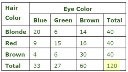 A math teacher records his students' hair color and eye color. The two way frequency table shows the results.