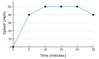 The graph displays the speed in miles per hour of a car for 25 minutes. During which period of time is the car stopped?