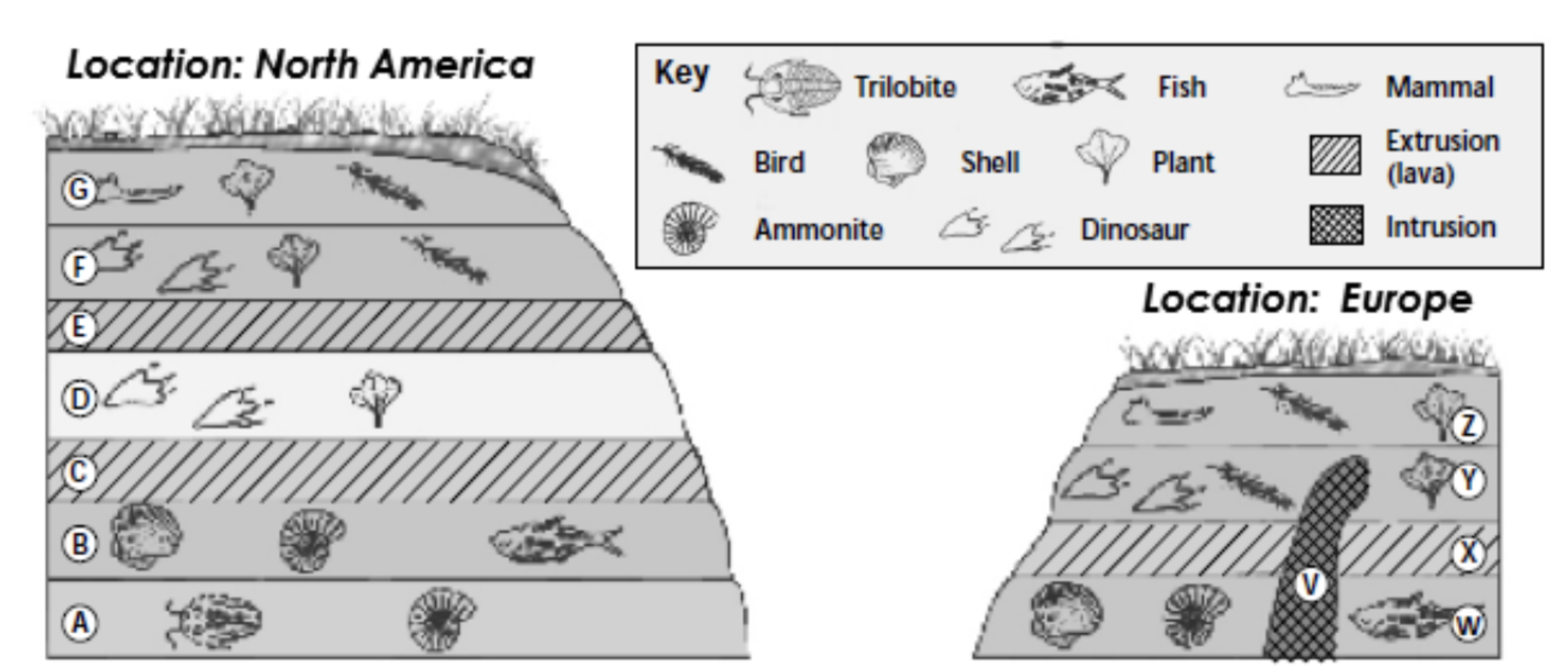 Use the index fossils in the image below to determine which rock layers in North America were formed at the same time as the corresponding layer in Europe.