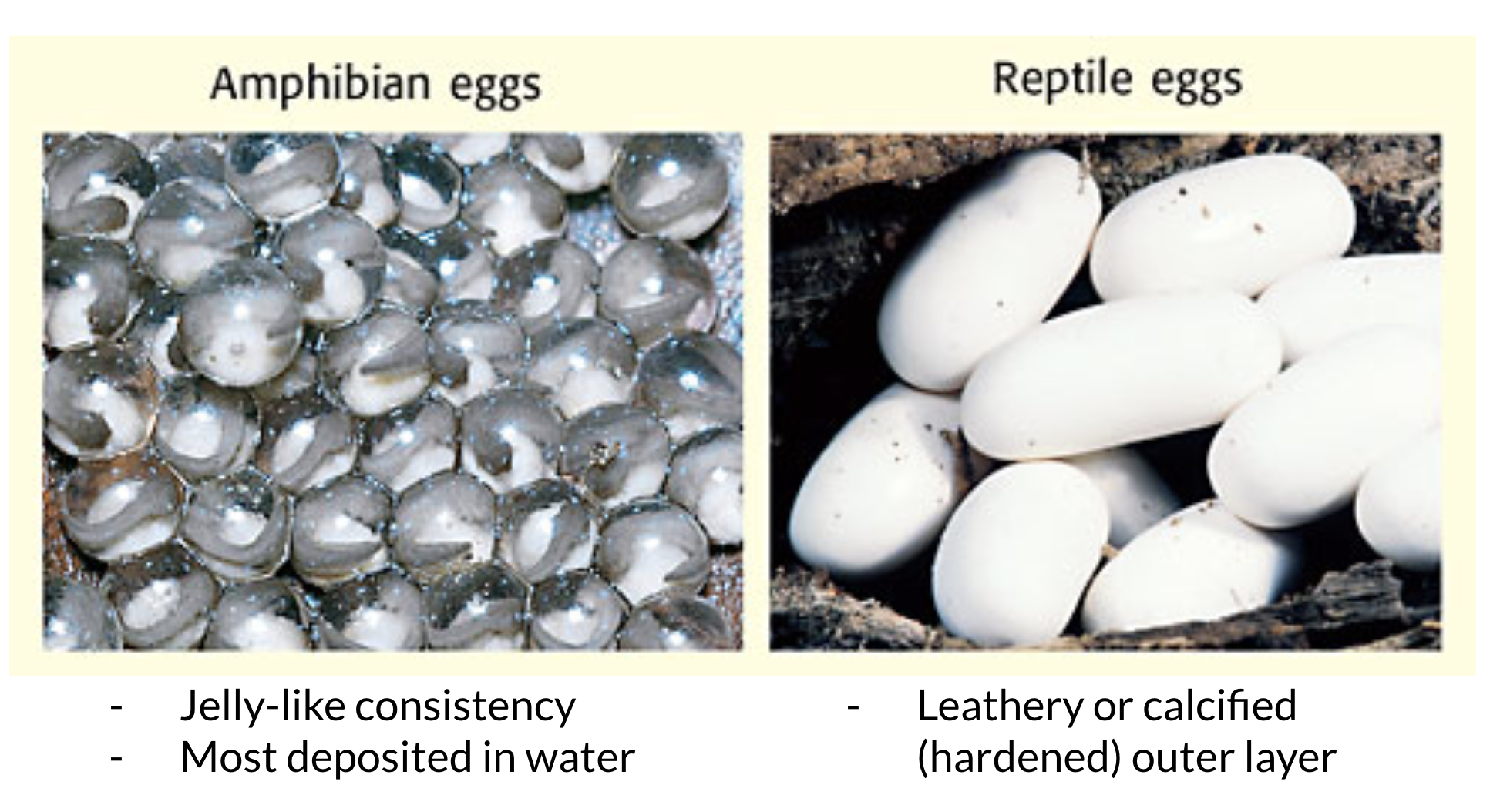 Based on the images of the eggs of amphibians and reptiles, what change in the complexity of the eggs allowed the reptiles to live solely on land? Why was this adaptation necessary?