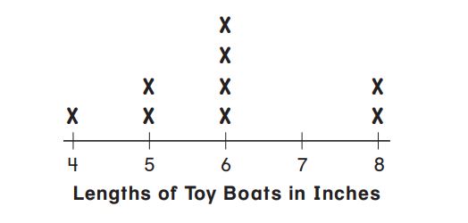 Drew made a line plot to show the lengths of his toy boats. How many boats are shown in the line plot? The line plot shows _______ toy boats. How many boats are 5 inches long? _______ boats.