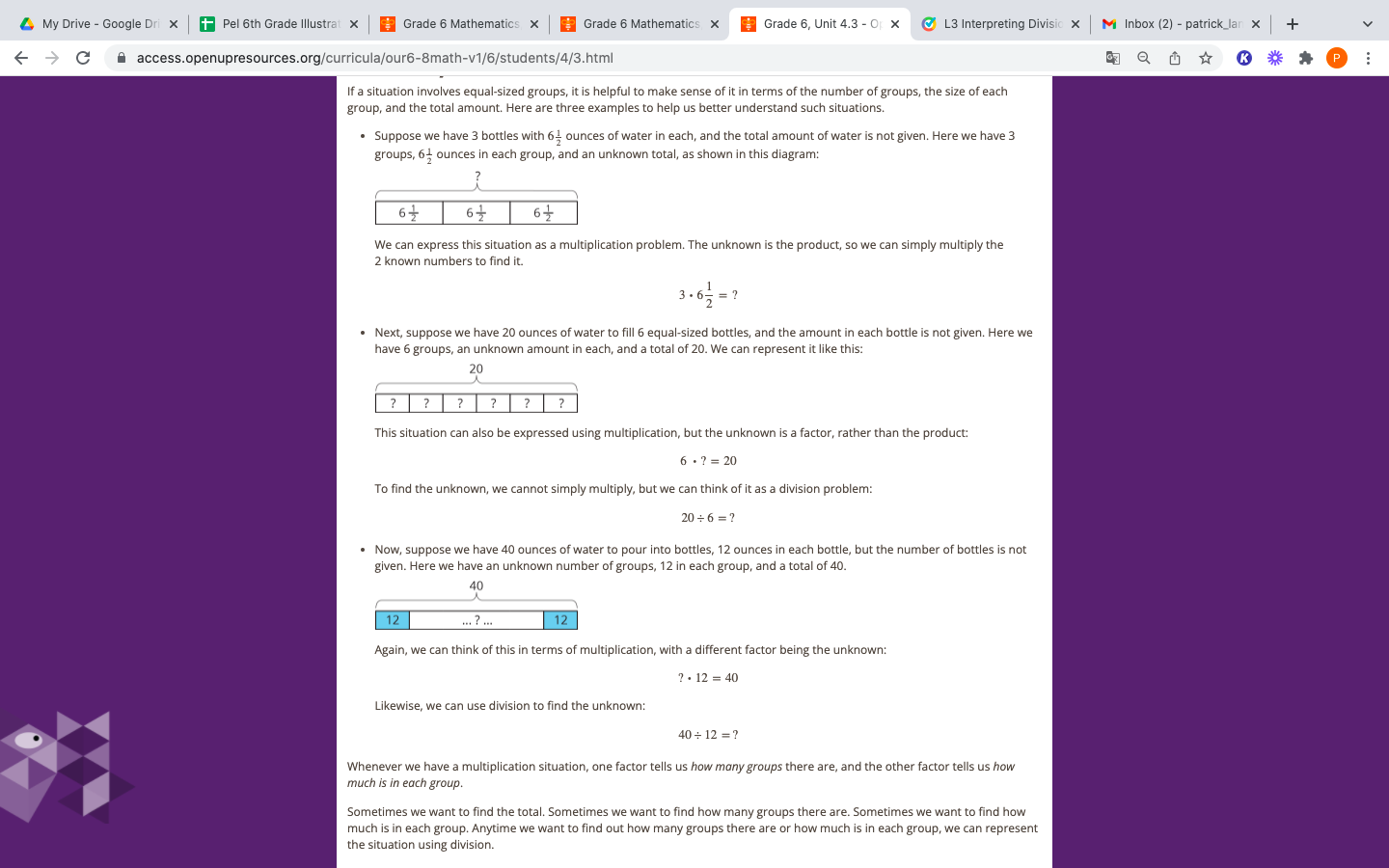 Write a multiplication equation and a division equation that represent this situation. Use “?” to represent the unknown quantity.