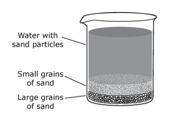 A group of students stirred sand into a beaker of water. The beaker was set on a table for 10 minutes. After 10 minutes, three layers formed in the beaker as shown in the diagram.