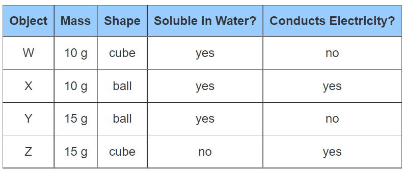 A scientist tested four objects: W, X, Y, and Z. Two of the objects were made of the same substance, and the other objects were made of different substances. The scientist collected the data in the table.