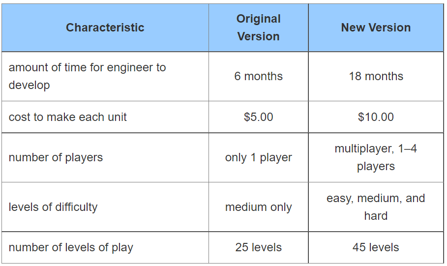A software engineer designed a new version of a video game. The original version of the game and the new version are compared in the table.