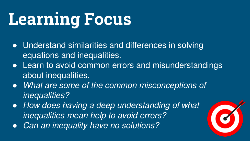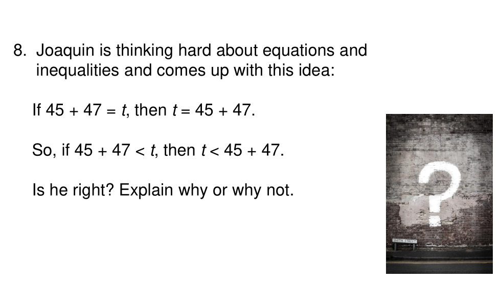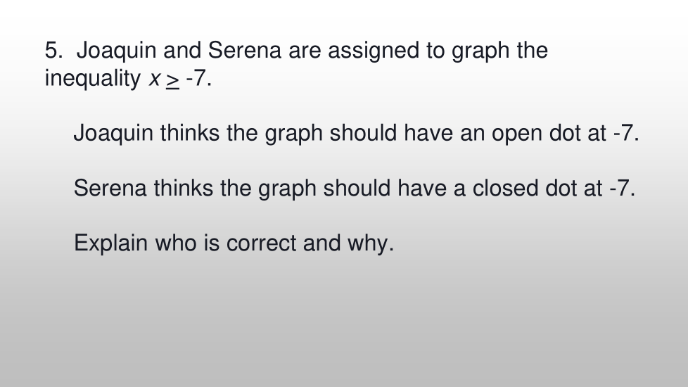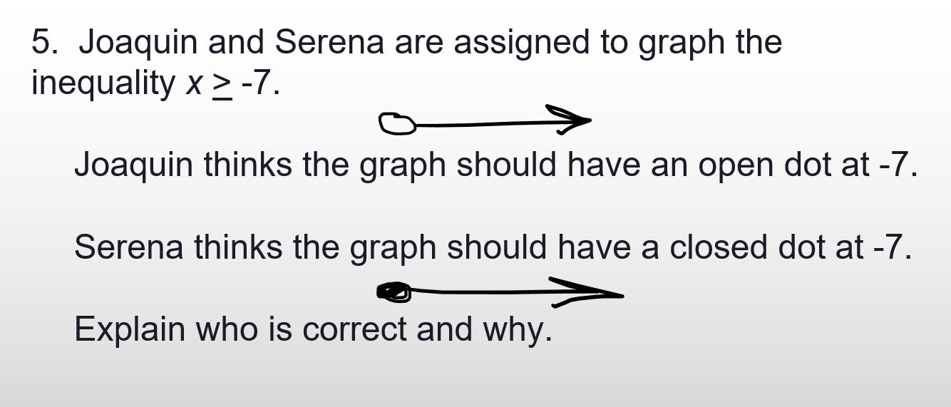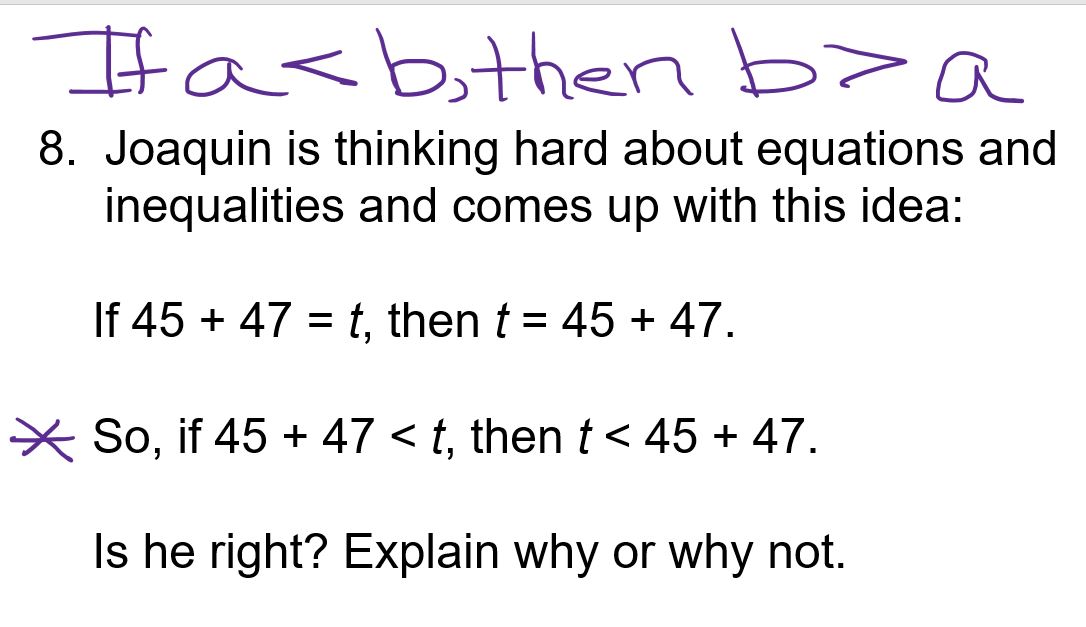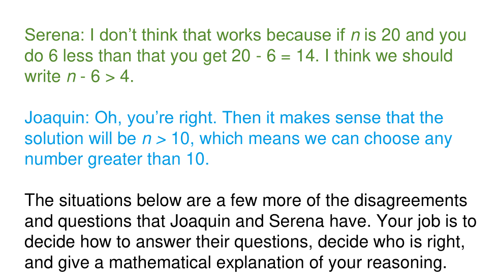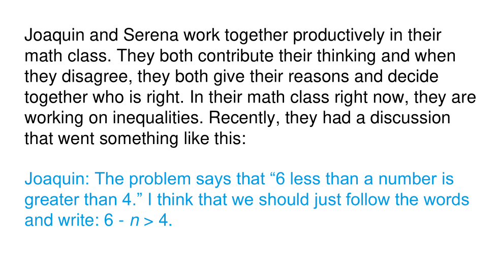 Joaquín y Serena trabajan juntos productivamente en su clase de matemáticas. Ambos aportan su pensamiento y cuando no están de acuerdo, ambos dan sus razones y deciden juntos quién tiene razón. En su clase de matemáticas en este momento, están trabajando en desigualdades. Recientemente, tuvieron una discusión que fue algo como esto: