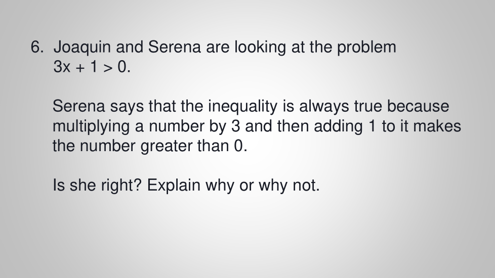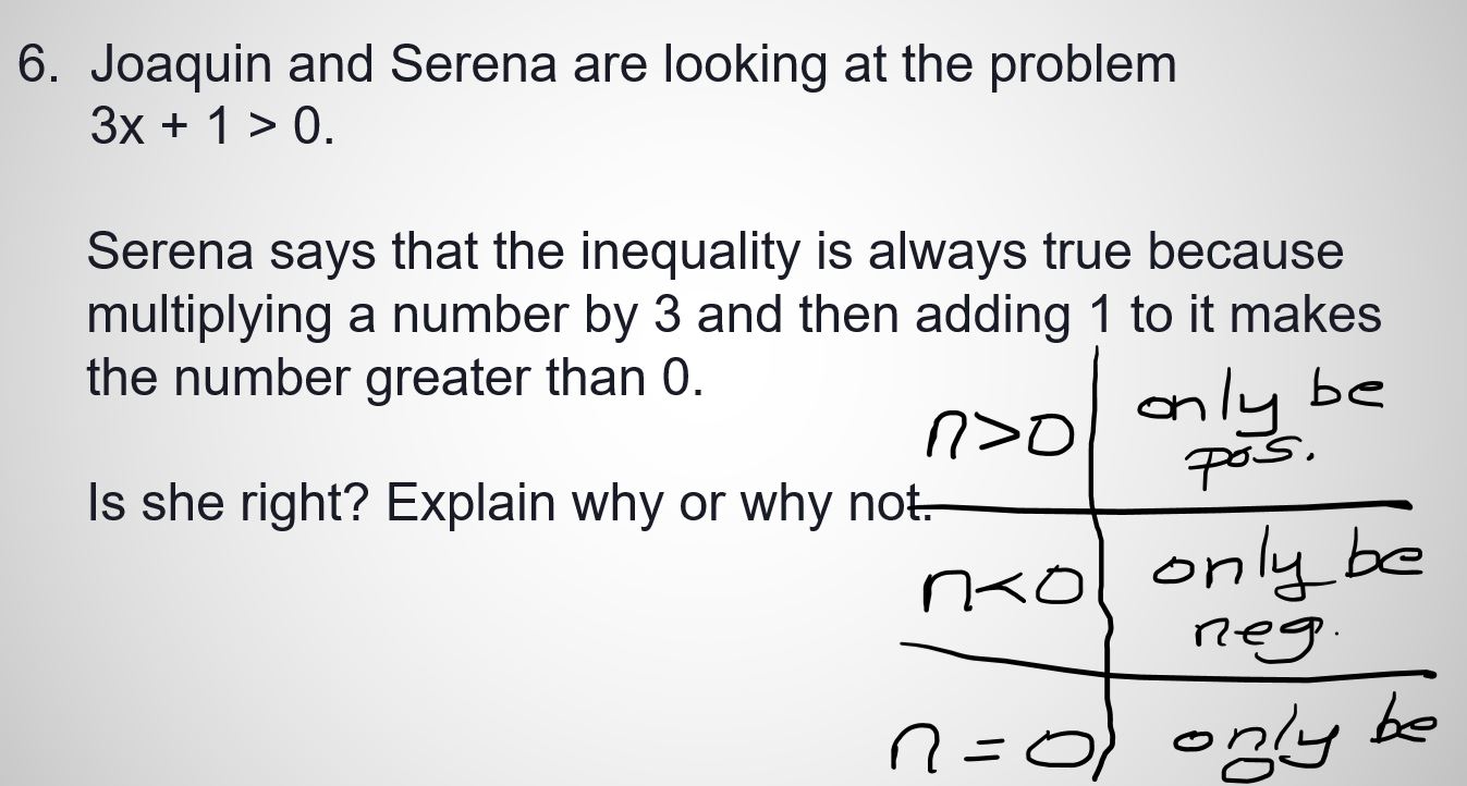 Joaquín y Serena están viendo el problema 3x + 1 > 0.