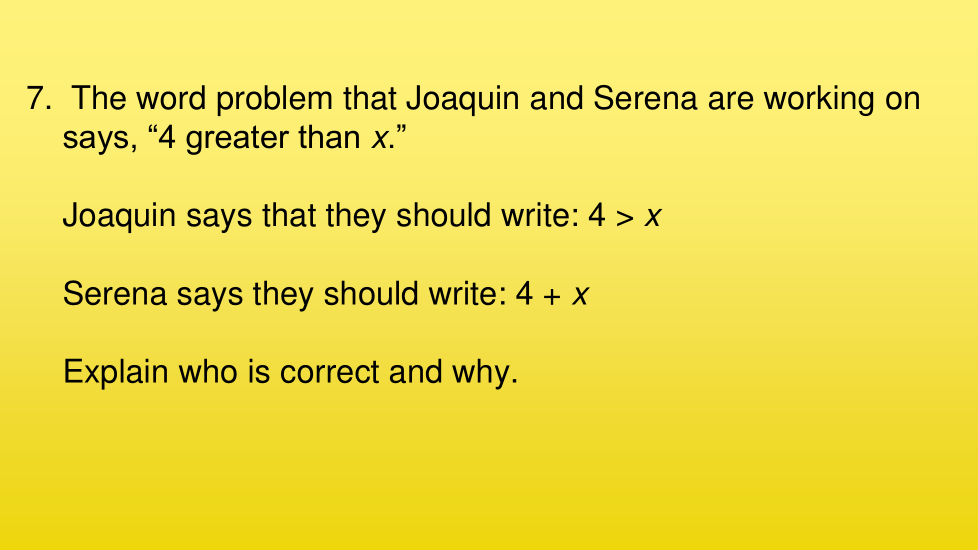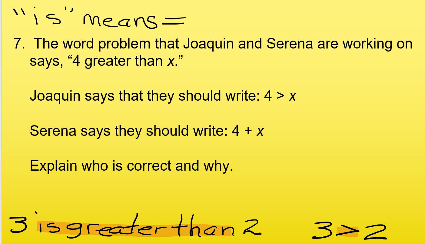 El problema verbal en el que están trabajando Joaquín y Serena dice: "4 mayor que x".