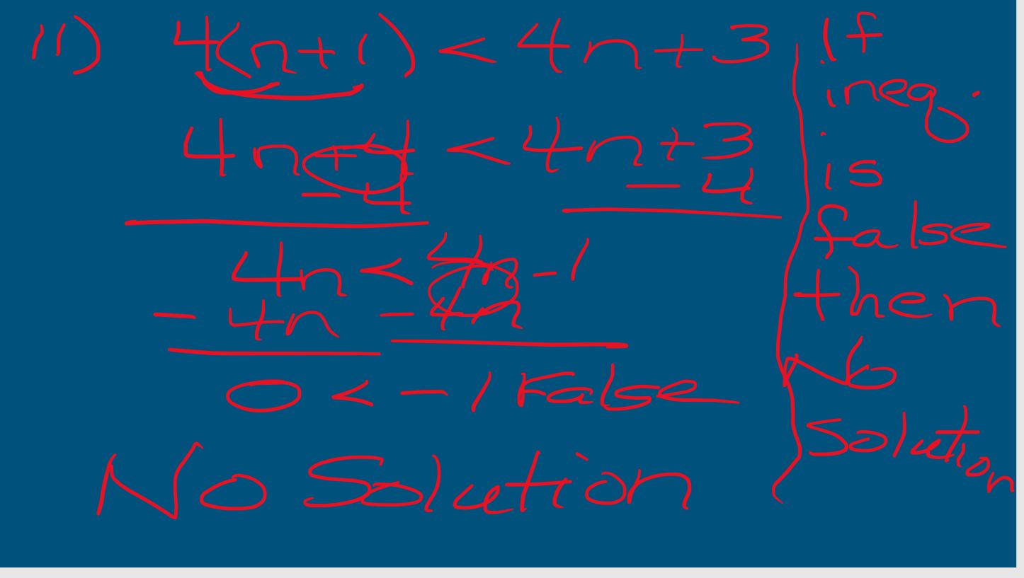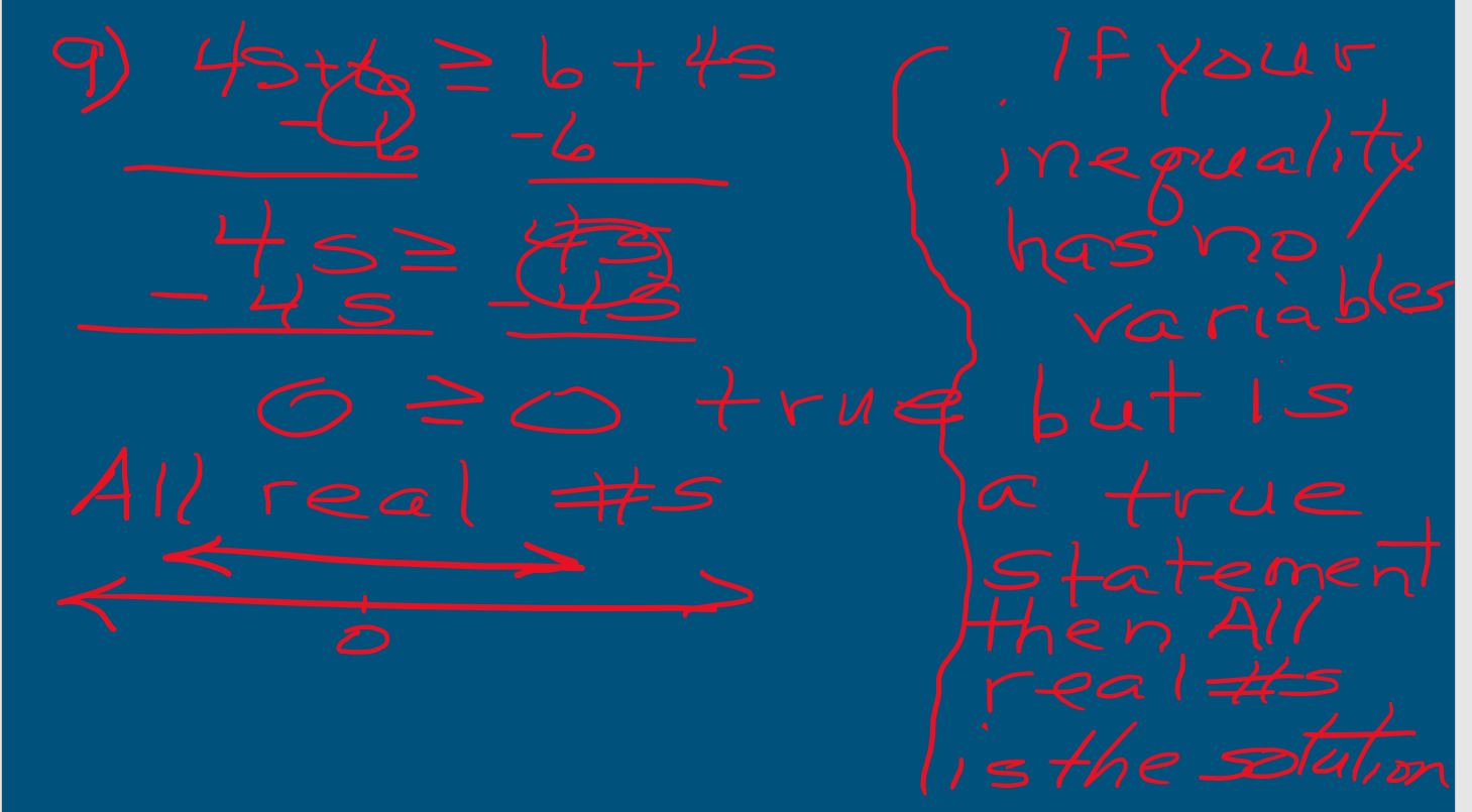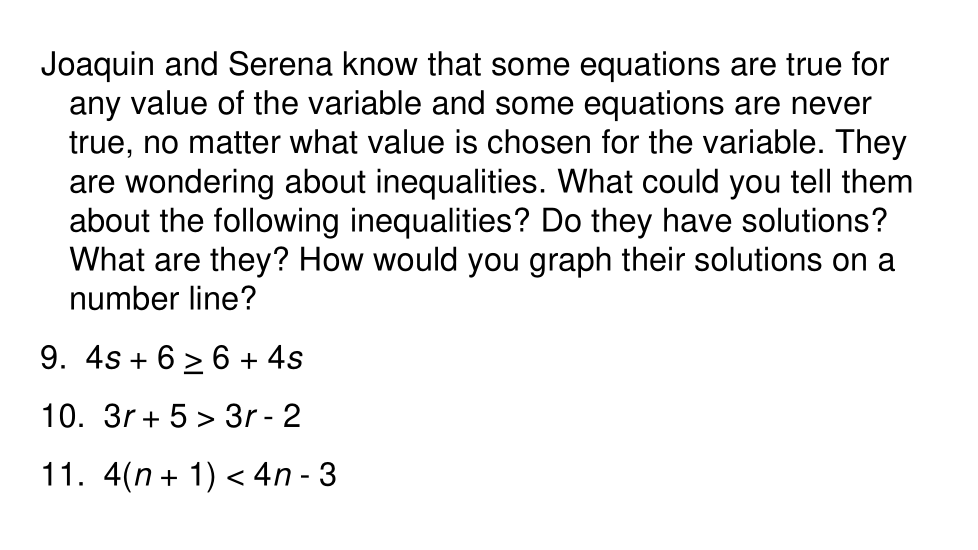 Joaquín y Serena saben que algunas ecuaciones son verdaderas para cualquier valor de la variable y algunas ecuaciones nunca son verdaderas, sin importar qué valor se elija para la variable. Se preguntan acerca de las desigualdades. ¿Qué podrías decirles acerca de las siguientes desigualdades? ¿Tienen soluciones? ¿Qué son? ¿Cómo representarías gráficamente sus soluciones en una recta numérica?