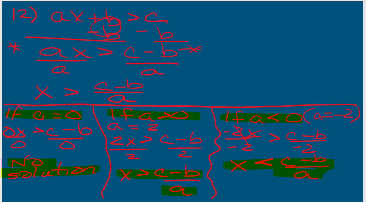 A los socios se les da la desigualdad literal ax + b > c para resolver x. Joaquín dice que lo resolverá como una ecuación. Serena dice que debe tener cuidado porque si a es un número negativo, la solución será diferente. ¿Qué dices? ¿Cuáles son las soluciones para la desigualdad?