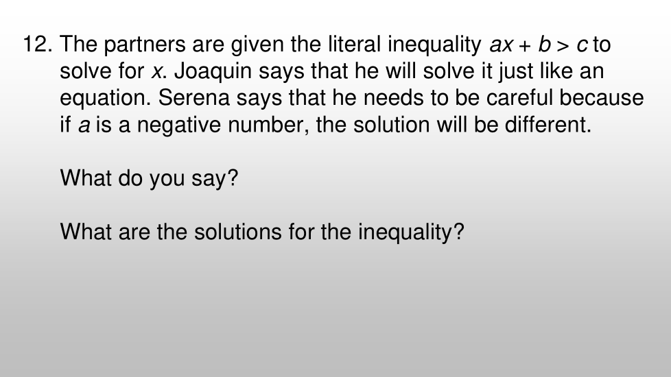 Washirika wamepewa shoka halisi la ukosefu wa ax + b > c kutatua kwa x. Joaquin anasema kwamba atalisuluhisha kama mlinganyo. Serena anasema anahitaji kuwa mwangalifu kwa sababu ikiwa a ni nambari hasi, suluhisho litakuwa tofauti. Unasema nini? Je, ni suluhisho gani la ukosefu wa usawa?