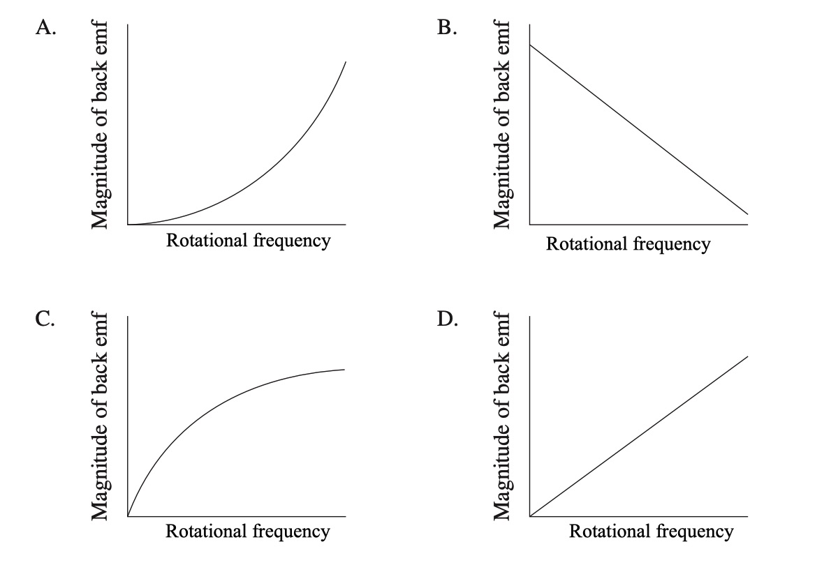 Which graph shows the magnitude of back emf induced in a DC motor rotating continuously as the rotational frequency increases.