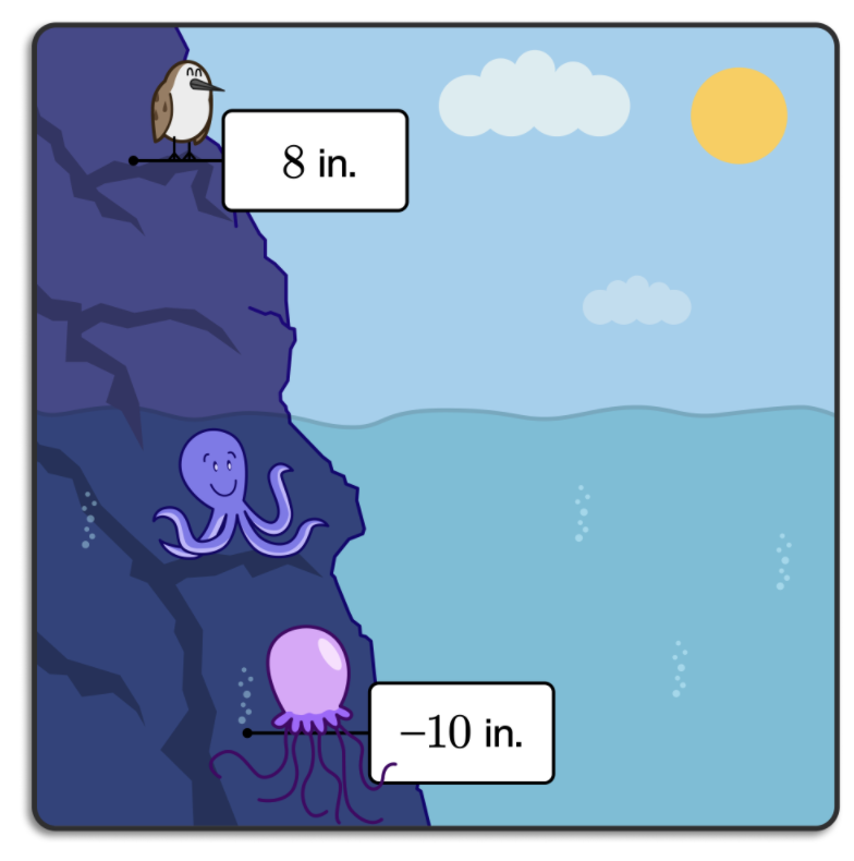 Here is the same snapshot of some creatures on the coast. The surface of the water has an elevation of 0 inches. Which creature’s elevation a greater absolute value?