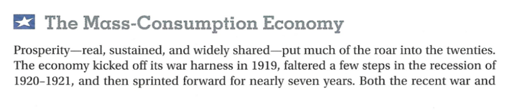 For many middle-class Americans, the Roaring 1920s was a decade of unprecedented _______ , which led to new patterns of _______ , or purchasing consumer goods like radios, cars, vacuums, beauty products or clothing.