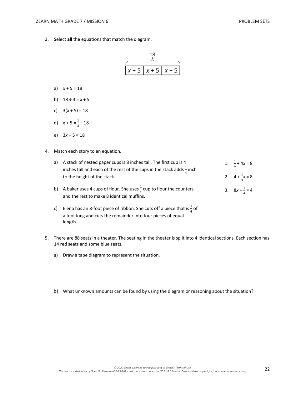 Elena has an 8-foot piece of ribbon. She cuts off a piece that is 1/4 of a foot long and cuts the remainder into 4 pieces of equal length. | arrow_right_alt | |