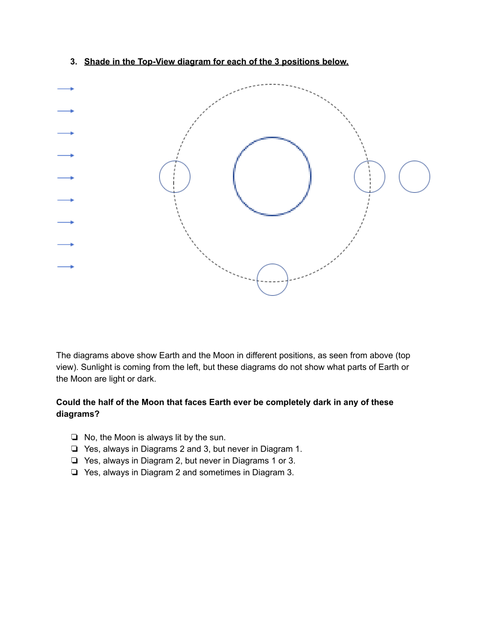 Could the half of the Moon that faces Earth ever be completely dark in any of these diagrams?