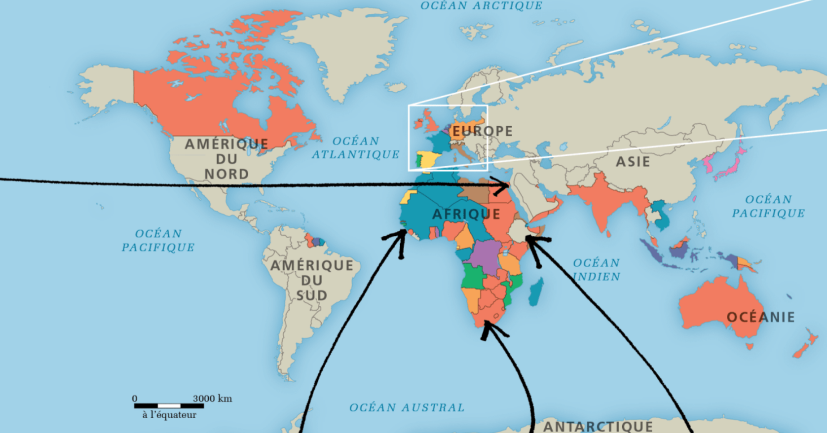 Au 19e siècle, les transport se développent rapidement. Le commerce maritime évolue entre autres grâce aux canaux. Clique sur la carte à l'endroit où se trouve le CANAL DE SUEZ