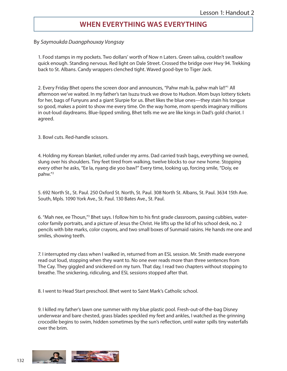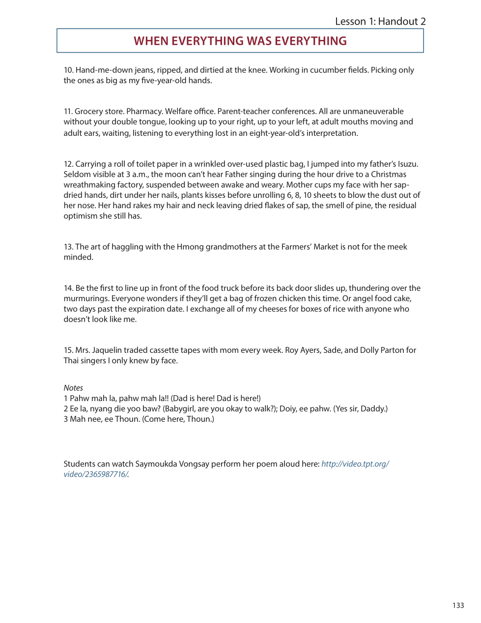 What images stood out to you the most? Why Were there any parts of the poem where you recognized a connection between Saymoukda’s experiences and your own?