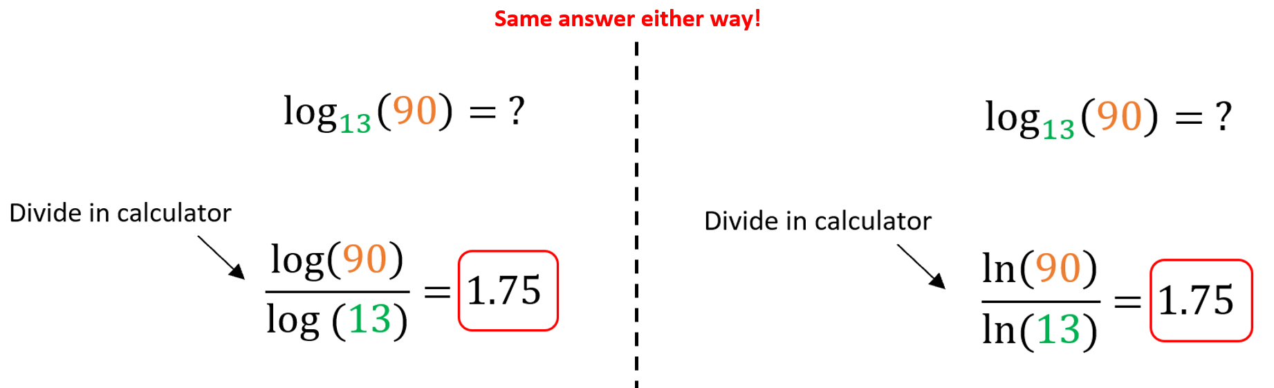 This formula allows us to evaluate logs in the calculator using the LOG button.