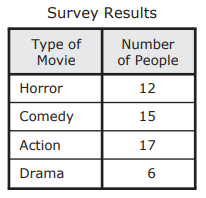The manager of a movie theater randomly surveyed 50 people who entered the movie theater on Friday. The manager asked about the type of movie each person preferred. The results of the survey are shown in the table.