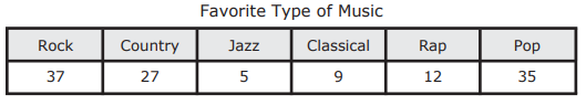 The manager of a music store surveyed a random sample of customers who shop in the store about their favorite type of music. The table shows the number of customers who selected each type of music.