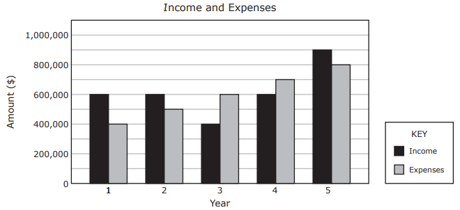 The bar graph shows a company’s income and expenses over the last 5 years.