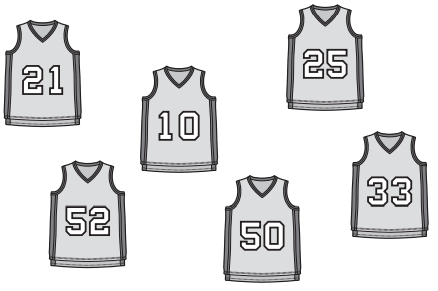 These six basketball jerseys are hanging on a wall. Lori’s favorite basketball players each have an odd number on their jerseys.