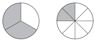 The models shown are the same size and are each divided into equal parts. The models are shaded to show two fractions.