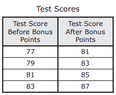 Mr. Morales gives bonus points when a challenge question on a test is answered correctly. The table shows the relationship between test scores before and after Mr. Morales gives the bonus points.