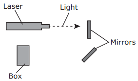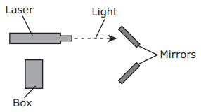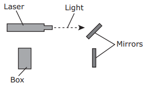 Lasers produce a beam of light that can be focused on a small area. A teacher uses two mirrors to shine a beam of light from a laser onto a box. Which diagram shows how the teacher should position the two mirrors?