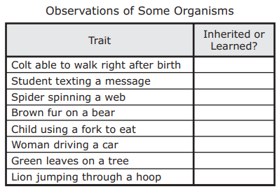 For a science assignment a student was asked to observe some organisms and then make a table to classify the organisms’ traits as inherited or learned. The student’s table is shown below.