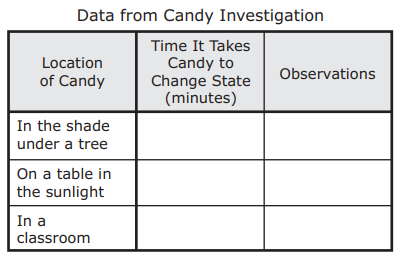 A student conducts an investigation using caramel candy, paper plates, and a stopwatch. The student places a piece of the caramel candy on each of three plates. The student puts the plates in different locations around the school. The student will record the time it takes for each piece of caramel candy to change state and other observations in the table below.