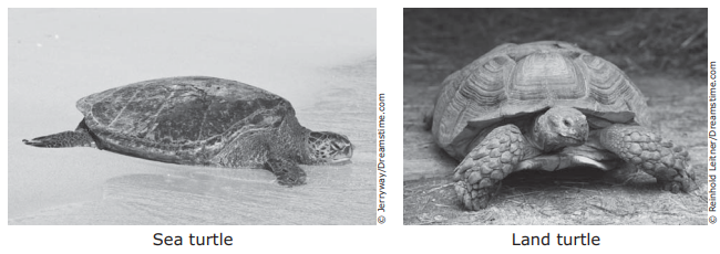 The shells of sea turtles are flatter than the shells of land turtles.