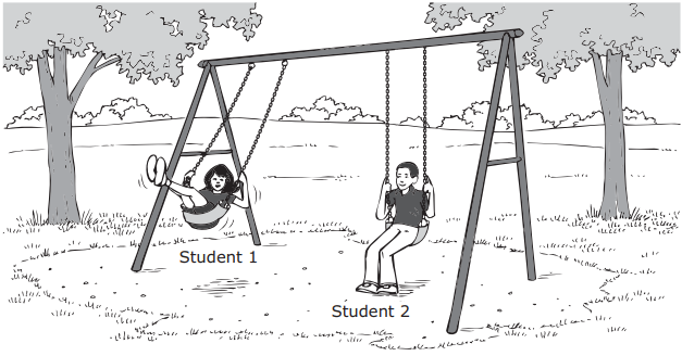 Two students are playing on a swing set. Student 1 is leaning back and extending her legs as she moves upward. Student 2 is sitting on the swing with his feet on the ground.