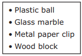 A student puts four objects in a bucket filled with water. The objects are listed below.