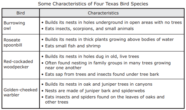 In parts of the East Texas Piney Woods ecosystem, there are forests with many tall pine trees. These thick forests have few other types of tall trees besides pine trees. The other plants growing in the ecosystem are usually small shrubs, grasses, and other short trees. A student wants to know what type of birds live in the Piney Woods region. The student reads the table shown below about four different birds.