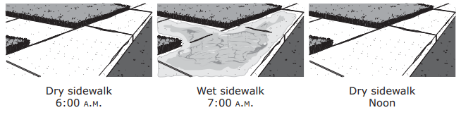 The pictures show a sidewalk at three different times on the same day. The changes were caused by the weather.