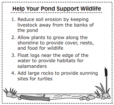 A farmer is reading a nature guide to learn how to make changes to a pond so that it will attract and support wildlife. The guide gives the suggestions listed below.